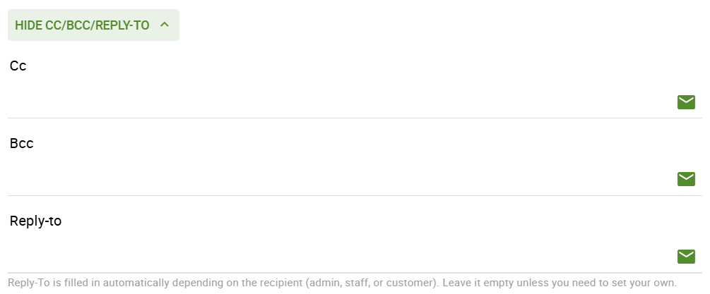 Along with the CC/BCC field, there is a Reply-to field that can be edited. By default, this field is automatically set depending on the recipient, and we recommend leaving it empty unless it’s necessary to set an email here.